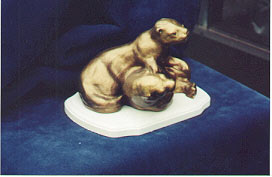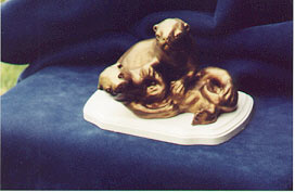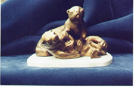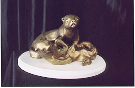 Pair of Otters: Otters are playful and gregarious animals. This sculpture is depicted in the original fired clay and is currently being cast for reproduction. The casting will be limited to 100 numbered pieces which will be offered in either bronze or “cold cast” bronze (filled polyurethane with a thin coating of bronze). Each piece will be cast upon receipt of one-half of the purchase price with the balance due prior to shipment. A numbered certificate of authenticity signed by the artist will accompany each sculpture.